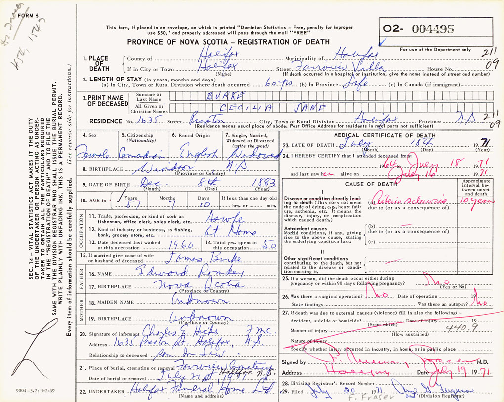21. Place of burial Fairview Cemetery, Halifax, NS