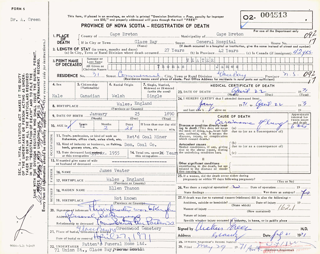 21. Place of burial Greenwood Cemetery, Glace Bay, NS