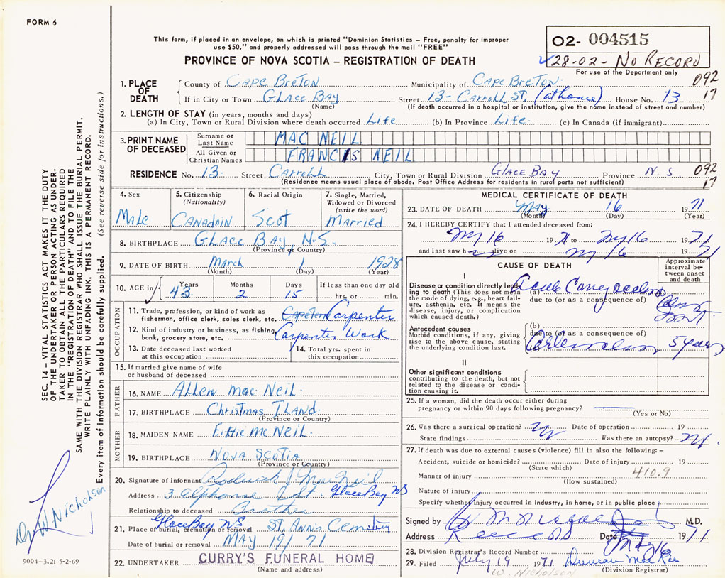 PROVINCE OF NOVA SCOTIA — REGISTRATION OF DEATH