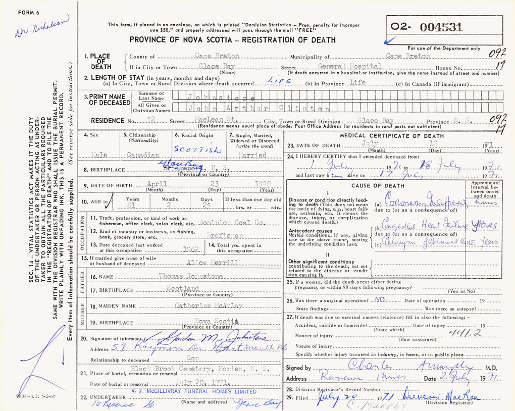 1. PLACE OF DEATH County of Cape Breton If in City or Town Glace Bay