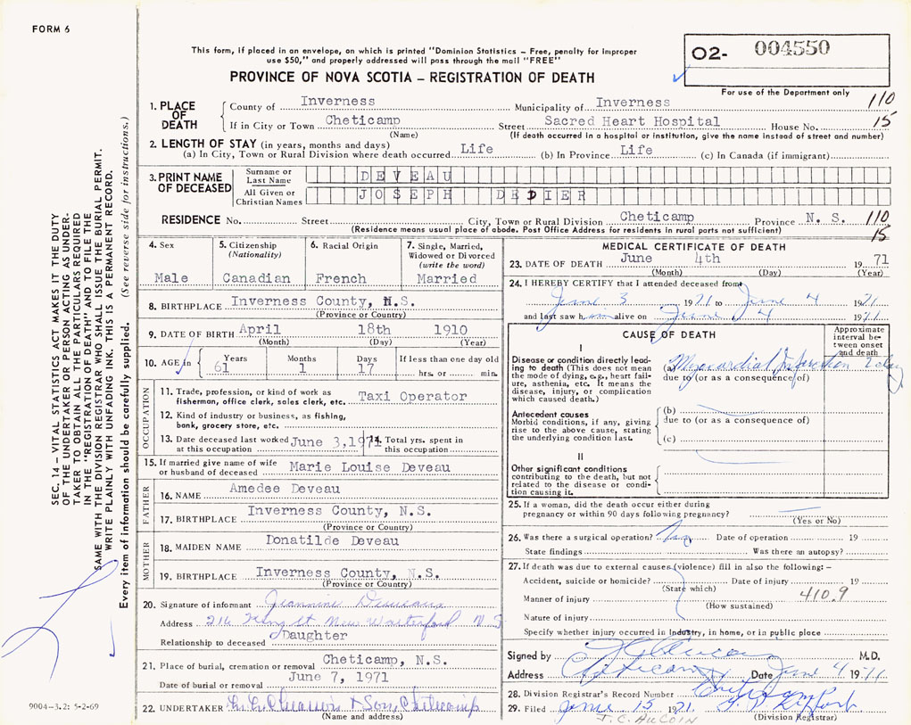 1. PLACE OF DEATH County of Inverness If in City or Town Cheticamp