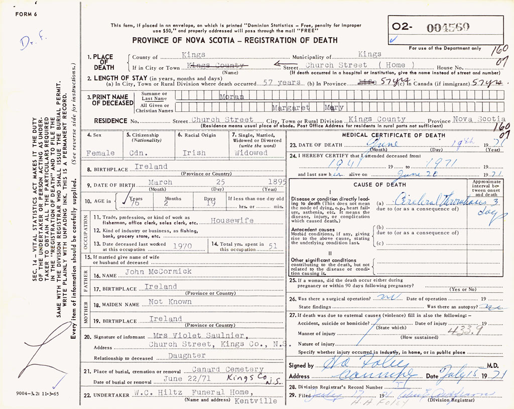 PROVINCE OF NOVA SCOTIA — REGISTRATION OF DEATH