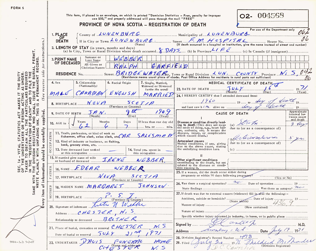 PROVINCE OF NOVA SCOTIA — REGISTRATION OF DEATH