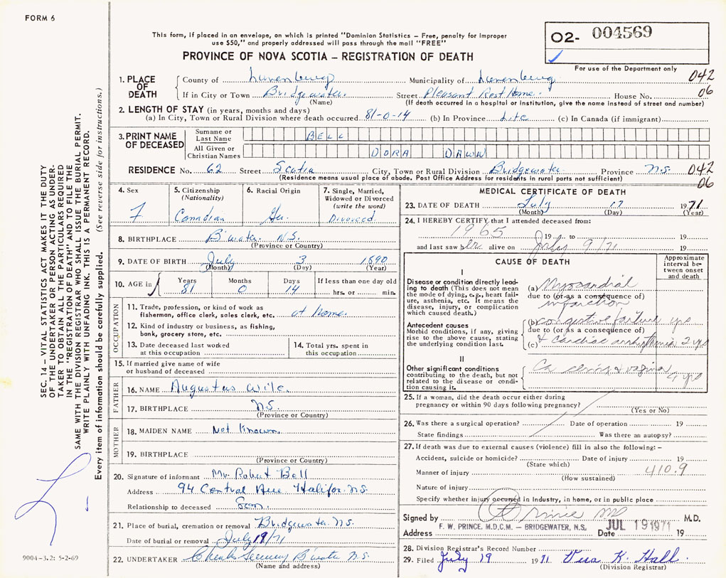 PROVINCE OF NOVA SCOTIA — REGISTRATION OF DEATH
