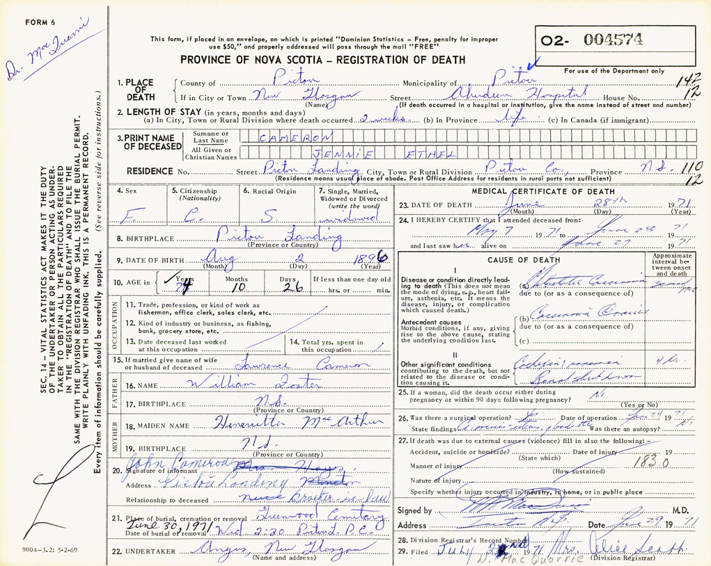 1. PLACE OF DEATH County of Pictou If in City or Town New Glasgow