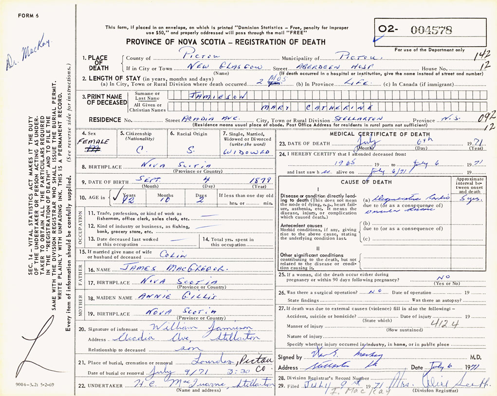 1. PLACE OF DEATH County of Pictou If in City or Town New Glasgow