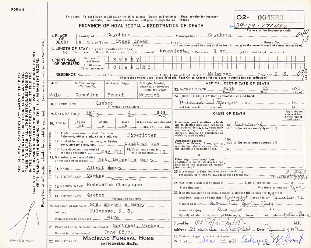 PROVINCE OF NOVA SCOTIA — REGISTRATION OF DEATH