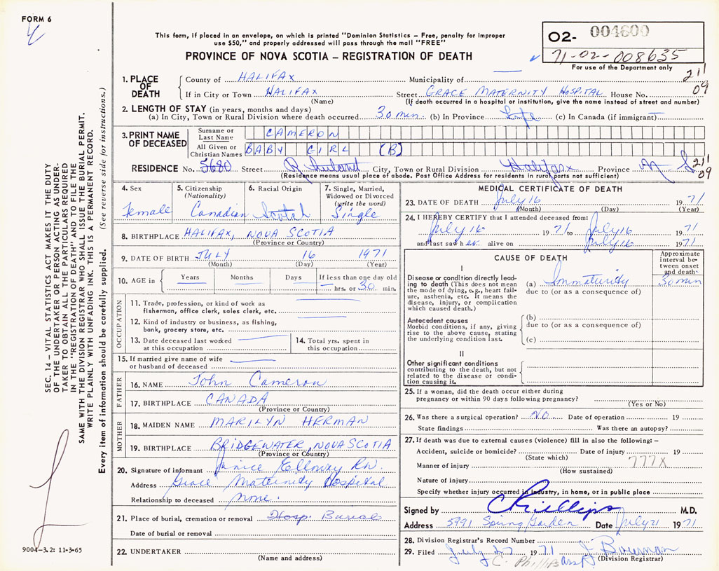 PROVINCE OF NOVA SCOTIA — REGISTRATION OF DEATH
