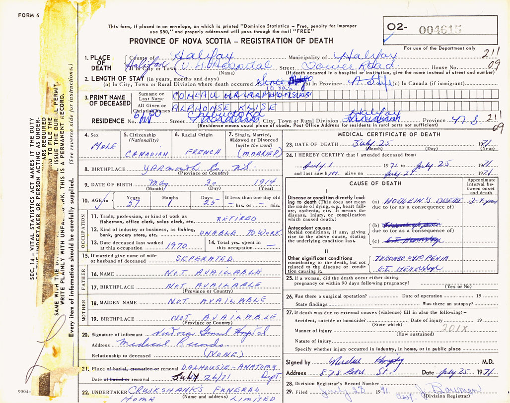 PROVINCE OF NOVA SCOTIA — REGISTRATION OF DEATH