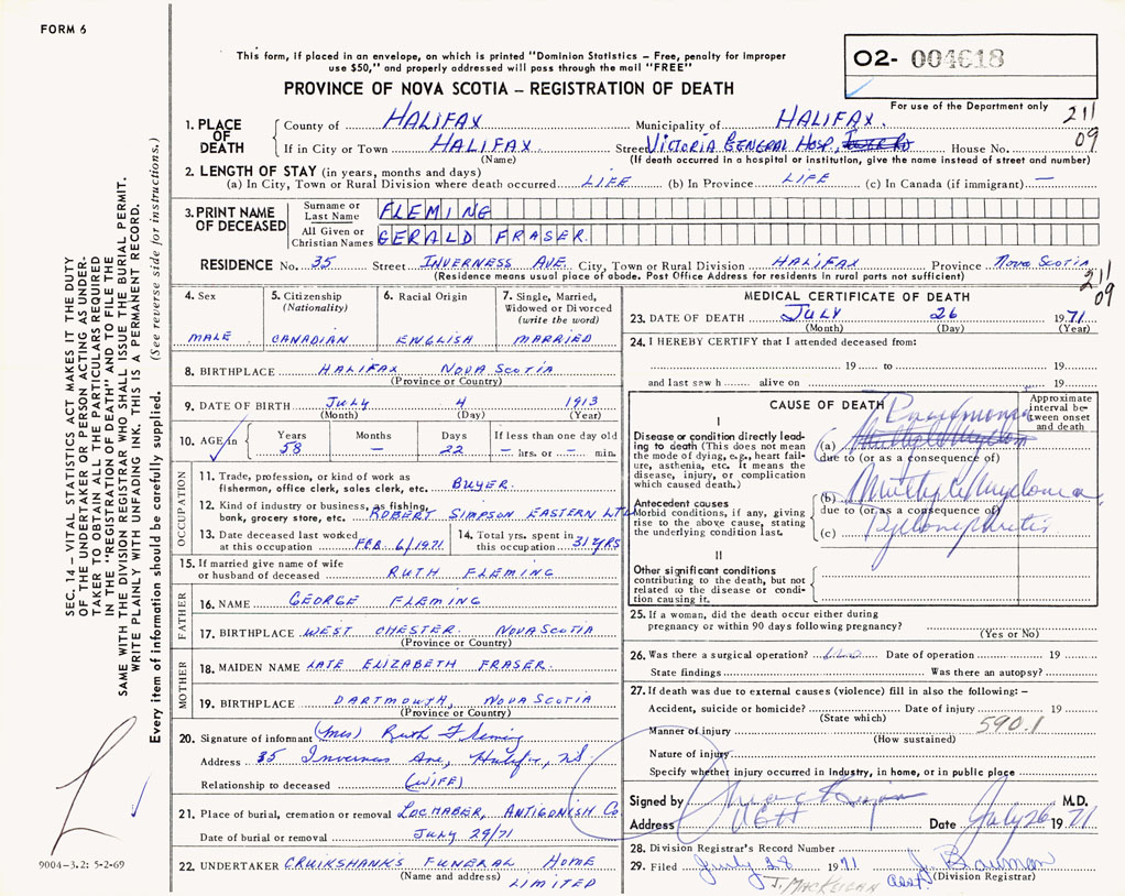 PROVINCE OF NOVA SCOTIA — REGISTRATION OF DEATH