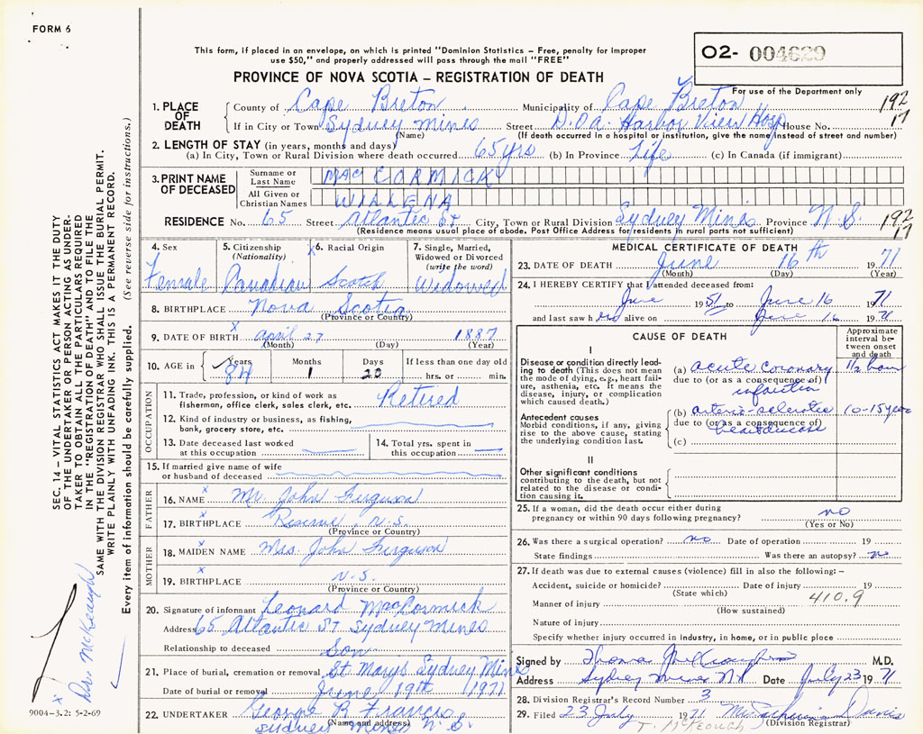 1. PLACE OF DEATH County of Cape Breton If in City or Town Sydney Mines