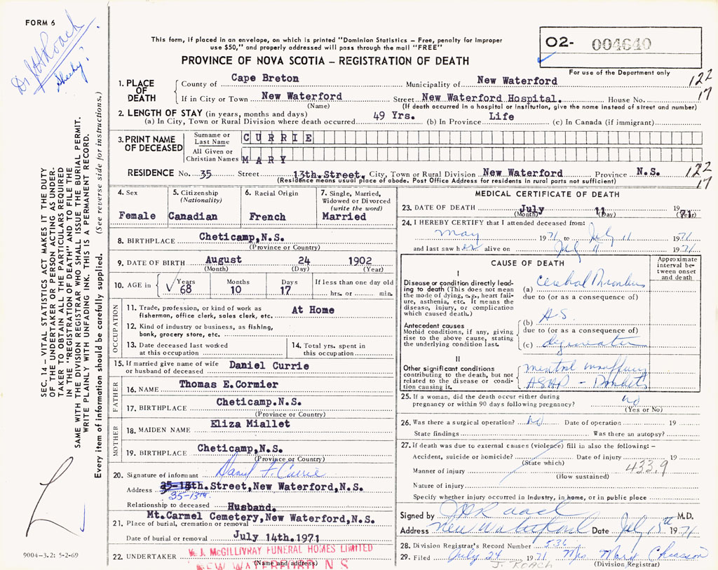 1. PLACE OF DEATH County of Cape Breton If in City or Town New Waterford