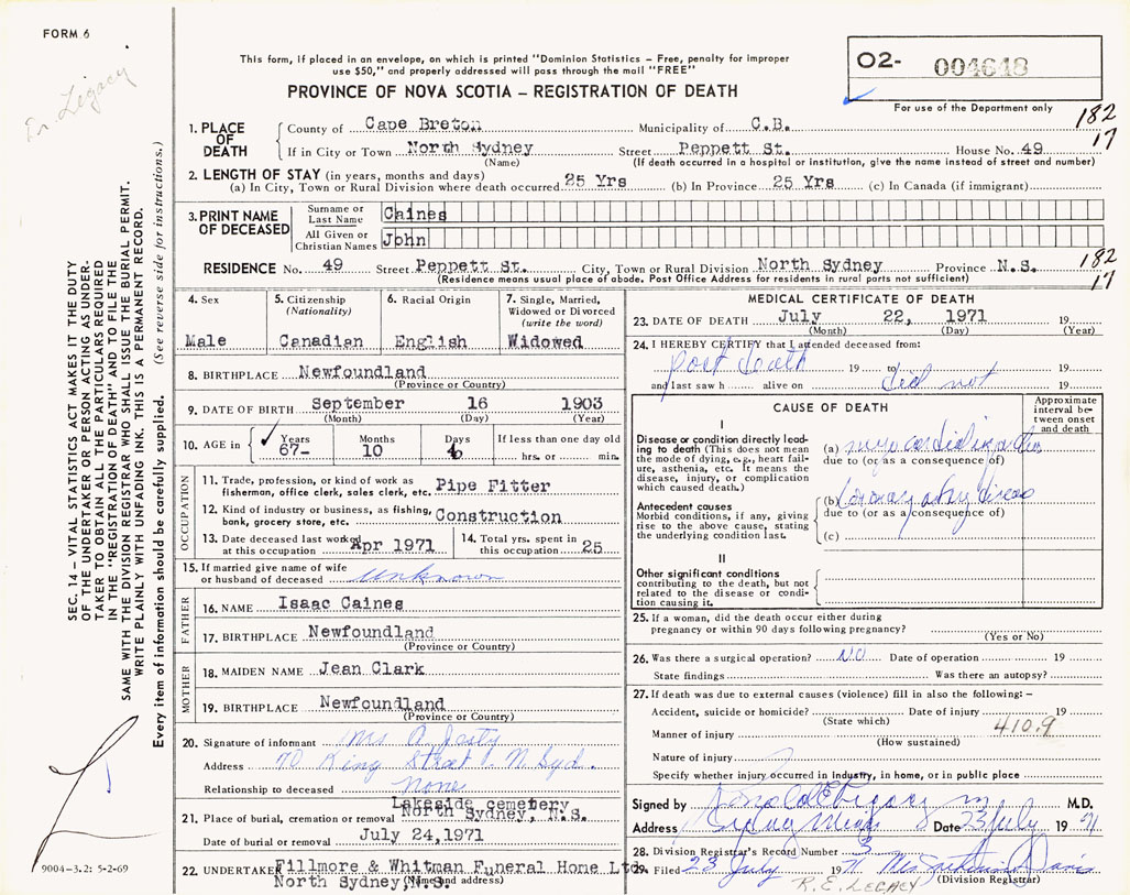 PROVINCE OF NOVA SCOTIA — REGISTRATION OF DEATH
