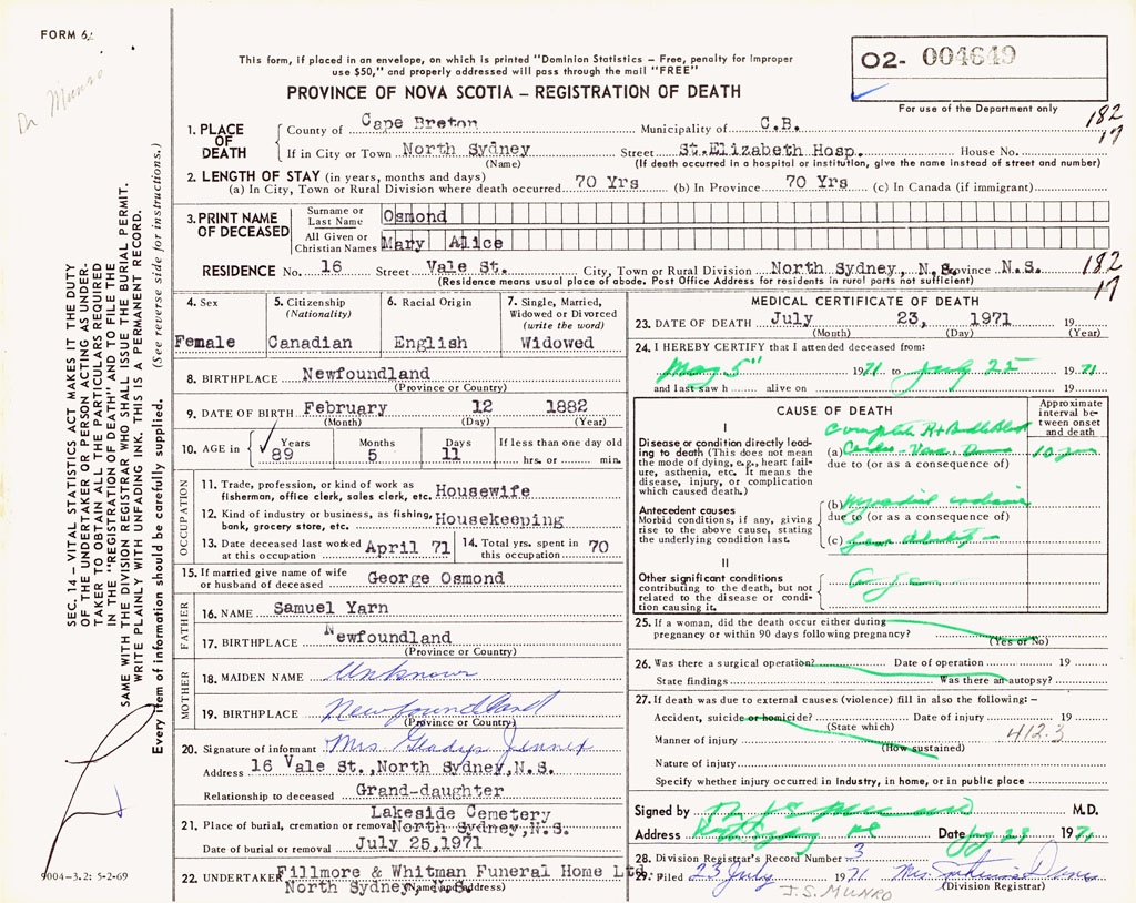 1. PLACE OF DEATH County of Cape Breton If in City or Town North Sydney