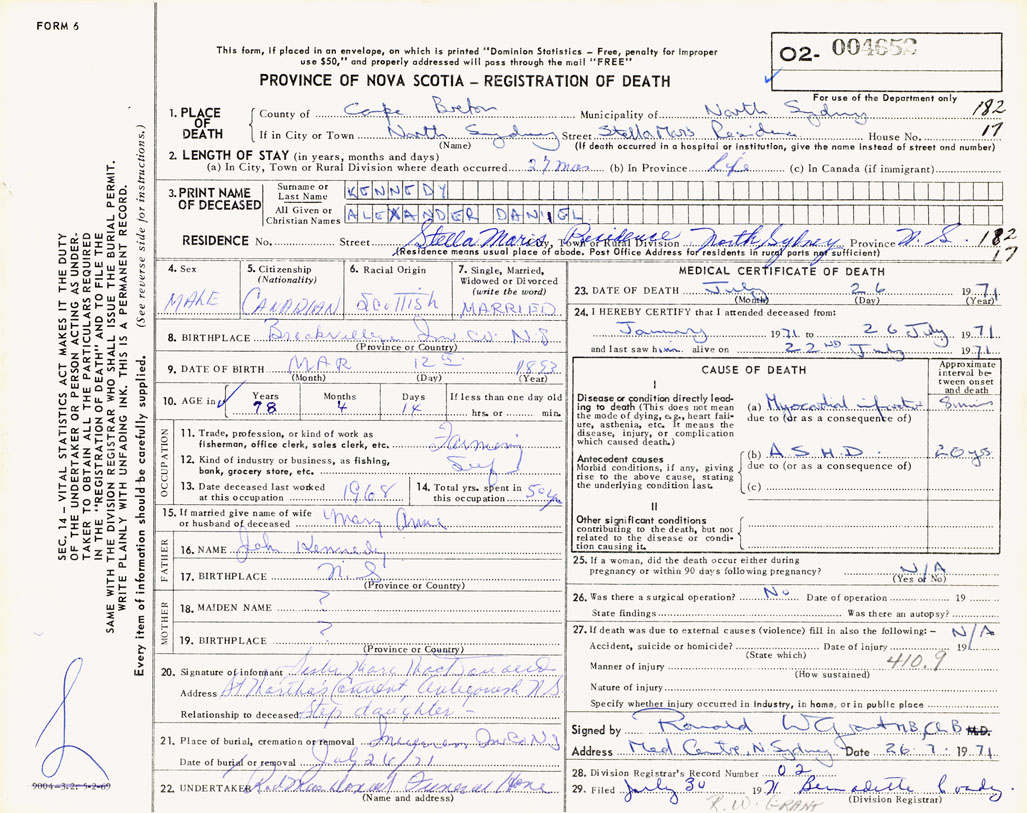PROVINCE OF NOVA SCOTIA — REGISTRATION OF DEATH