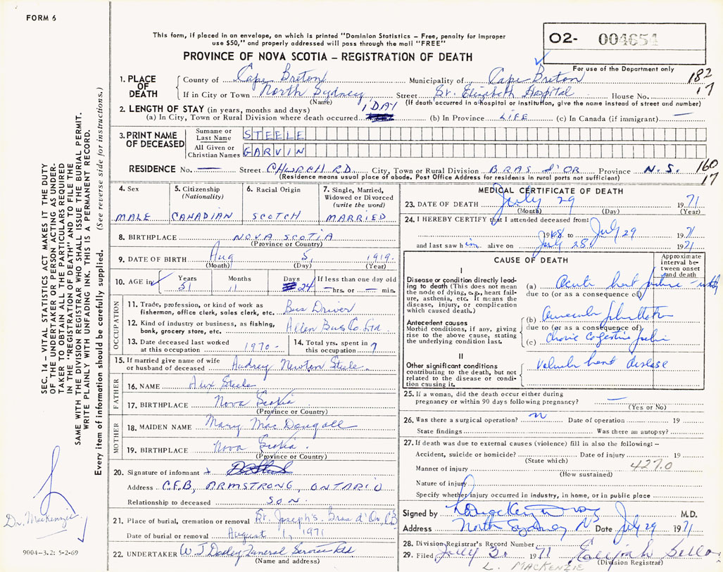PROVINCE OF NOVA SCOTIA — REGISTRATION OF DEATH