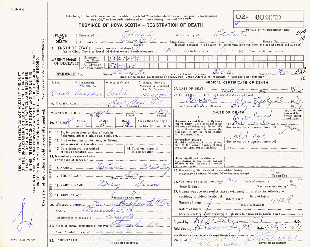 PROVINCE OF NOVA SCOTIA — REGISTRATION OF DEATH