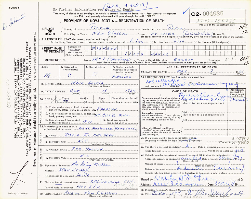 1. PLACE OF DEATH County of Pictou If in City or Town New Glasgow