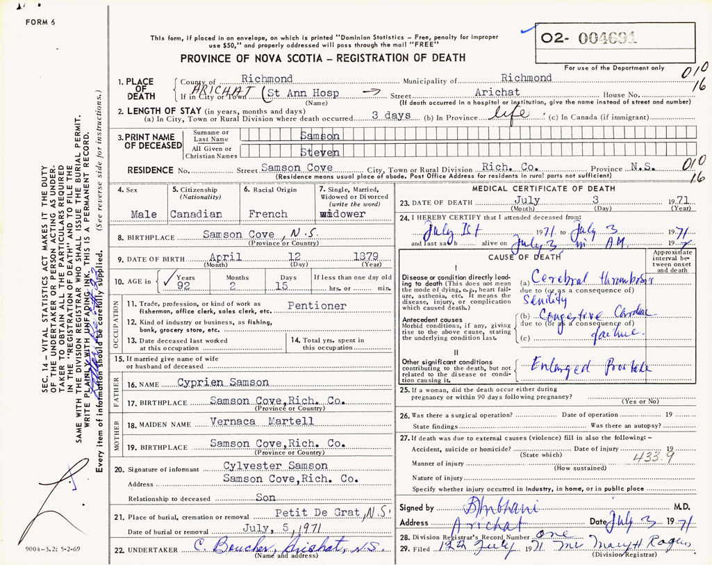 19. BIRTHPLACE Sampson Cove, Rich. Co., NS