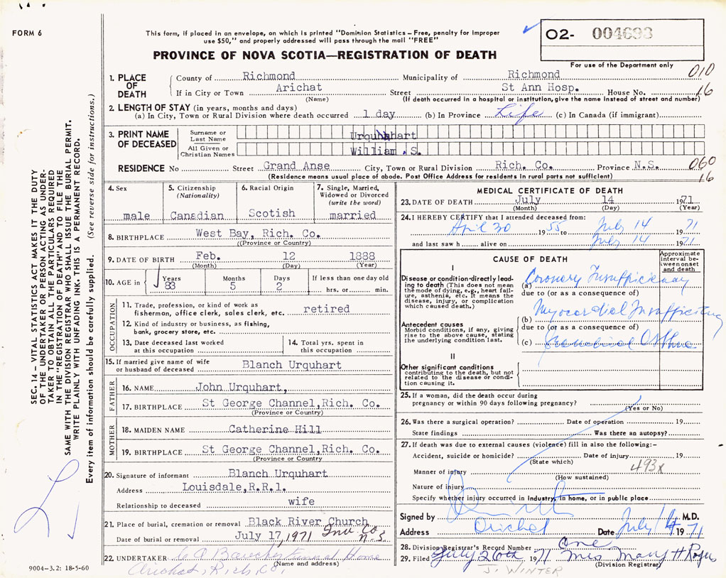 PROVINCE OF NOVA SCOTIA — REGISTRATION OF DEATH