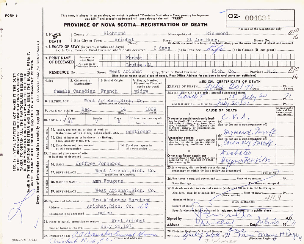 1. PLACE OF DEATH County of Richmond If in City or Town Arichat