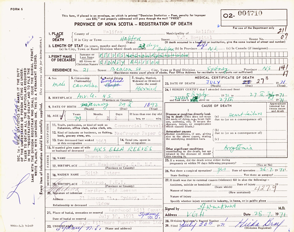 PROVINCE OF NOVA SCOTIA — REGISTRATION OF DEATH