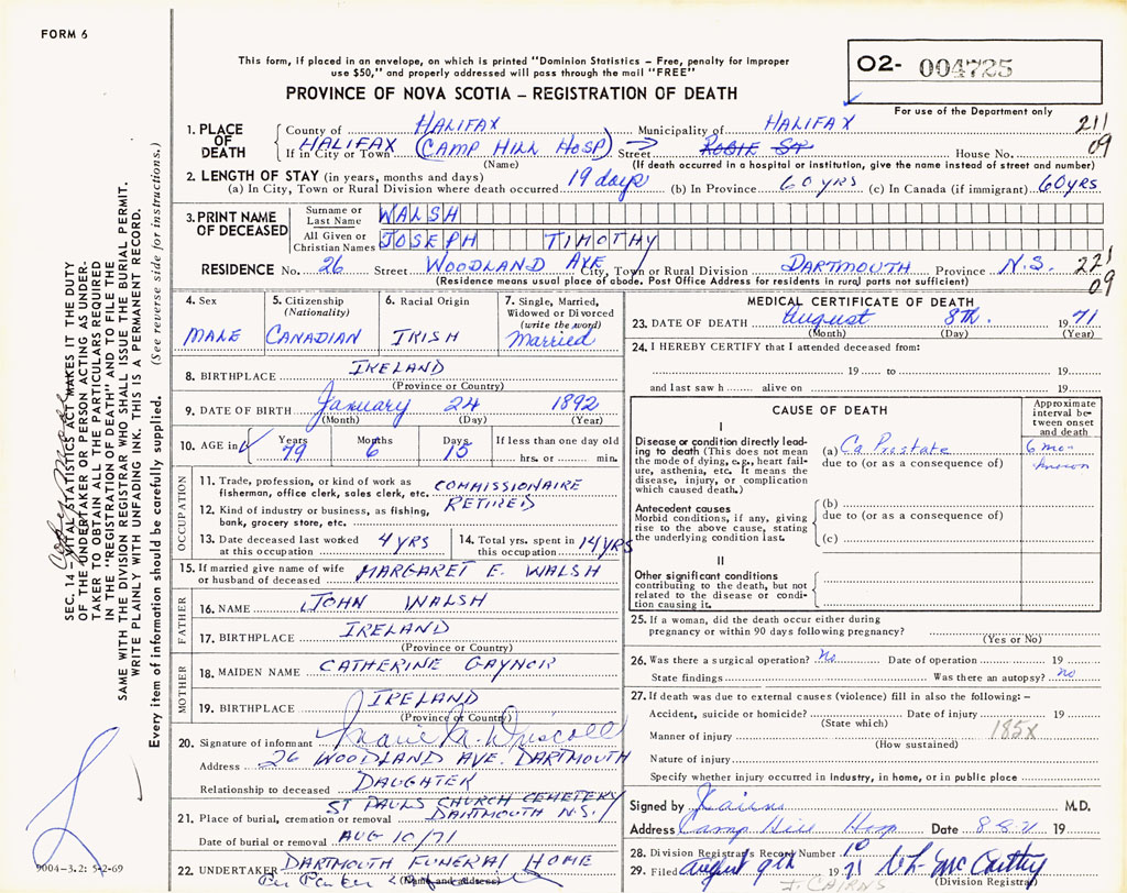 PROVINCE OF NOVA SCOTIA — REGISTRATION OF DEATH