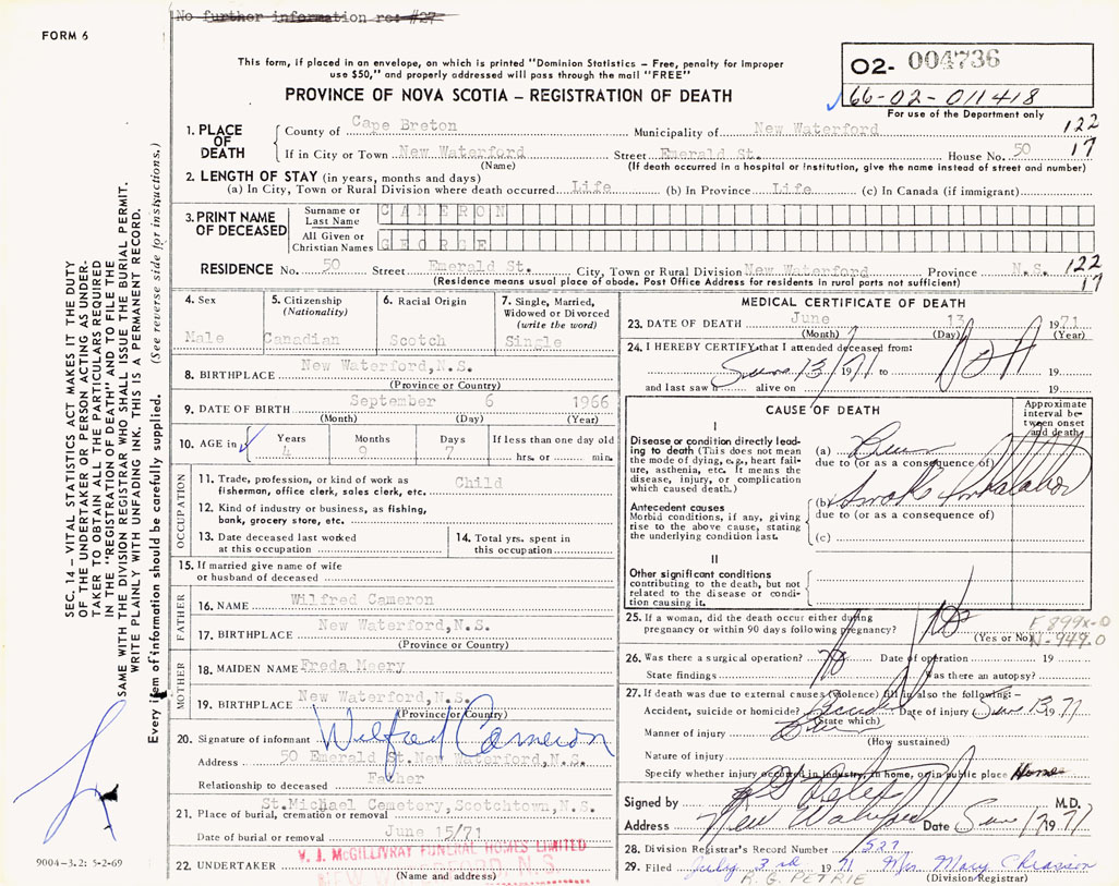 PROVINCE OF NOVA SCOTIA — REGISTRATION OF DEATH