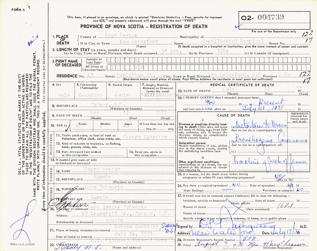 21. Place of burial Hebrew Cemetery, Sydney, NS