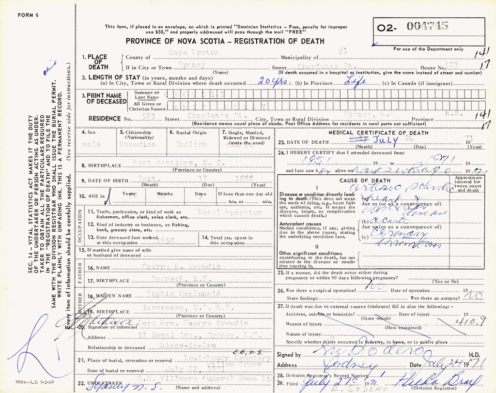 1. PLACE OF DEATH County of Cape Breton If in City or Town Sydney