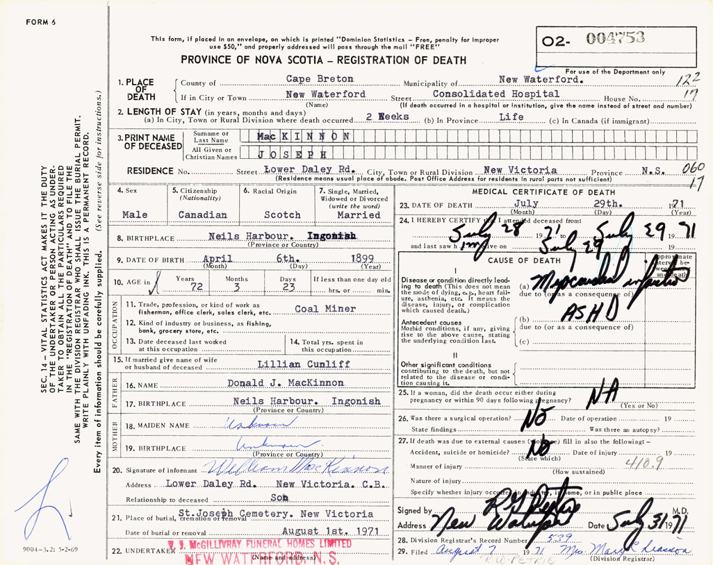 1. PLACE OF DEATH County of Cape Breton If in City or Town New Waterford