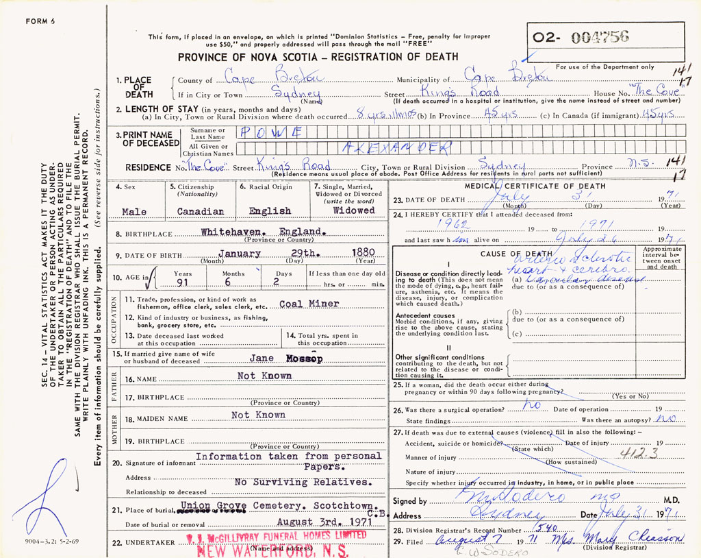 PROVINCE OF NOVA SCOTIA — REGISTRATION OF DEATH