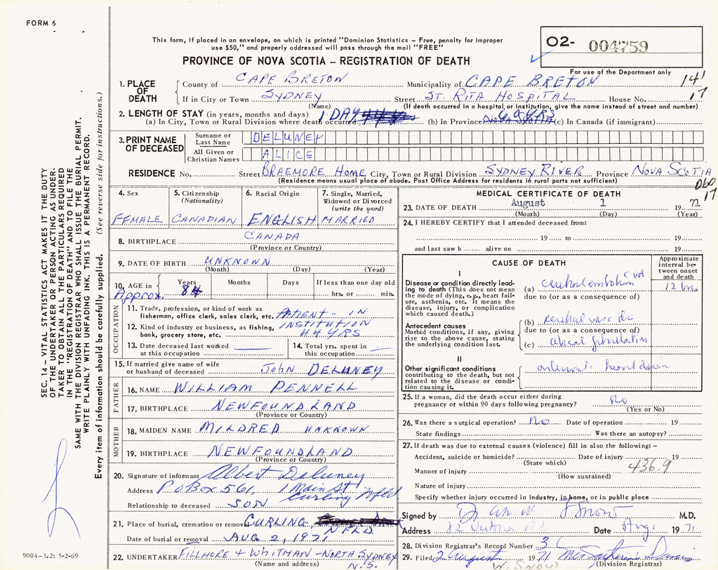 PROVINCE OF NOVA SCOTIA — REGISTRATION OF DEATH