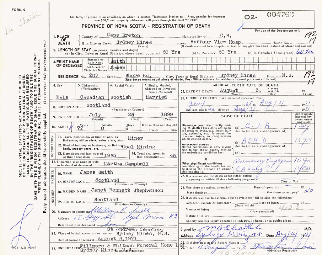1. PLACE OF DEATH County of Cape Breton If in City or Town Sydney Mines