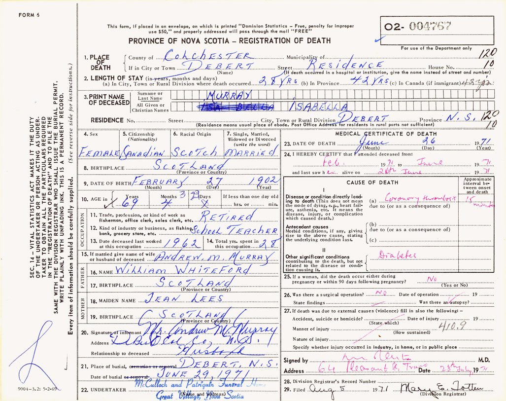 PROVINCE OF NOVA SCOTIA — REGISTRATION OF DEATH