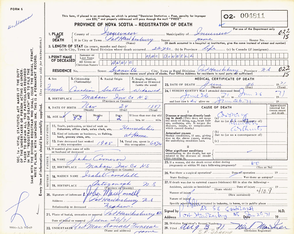 PROVINCE OF NOVA SCOTIA — REGISTRATION OF DEATH