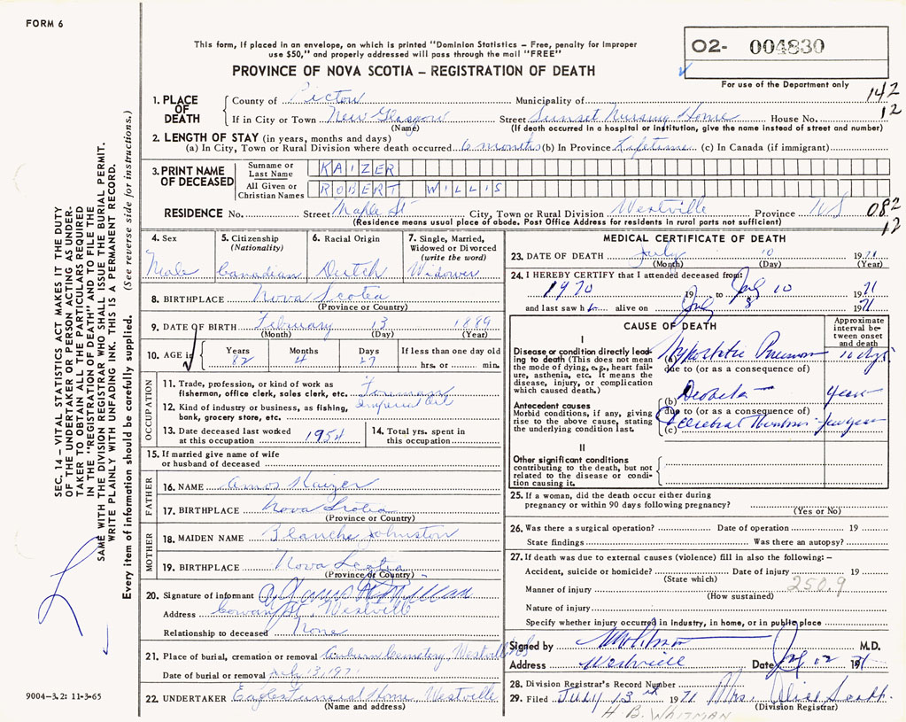 PROVINCE OF NOVA SCOTIA — REGISTRATION OF DEATH