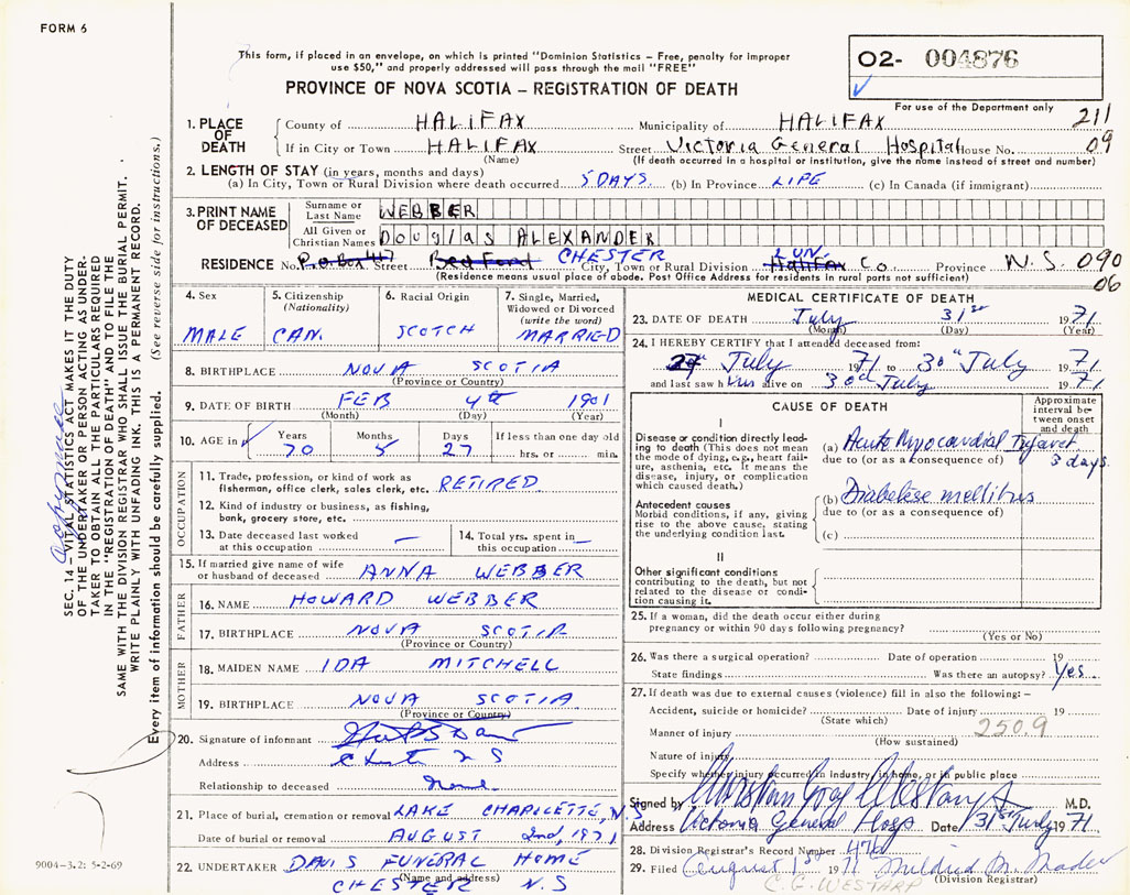 PROVINCE OF NOVA SCOTIA — REGISTRATION OF DEATH