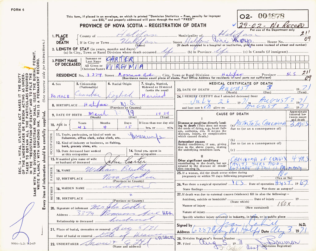 PROVINCE OF NOVA SCOTIA — REGISTRATION OF DEATH