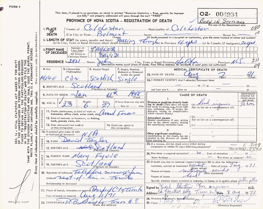 PROVINCE OF NOVA SCOTIA — REGISTRATION OF DEATH