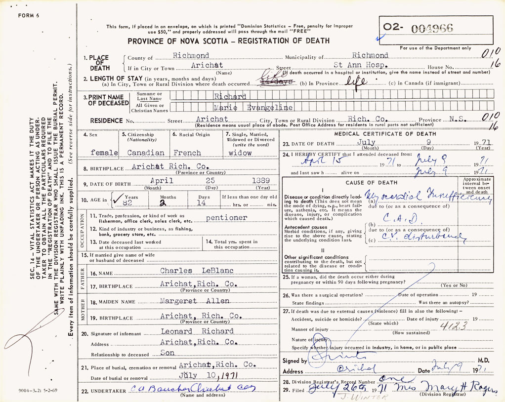 1. PLACE OF DEATH County of Richmond If in City or Town Arichat