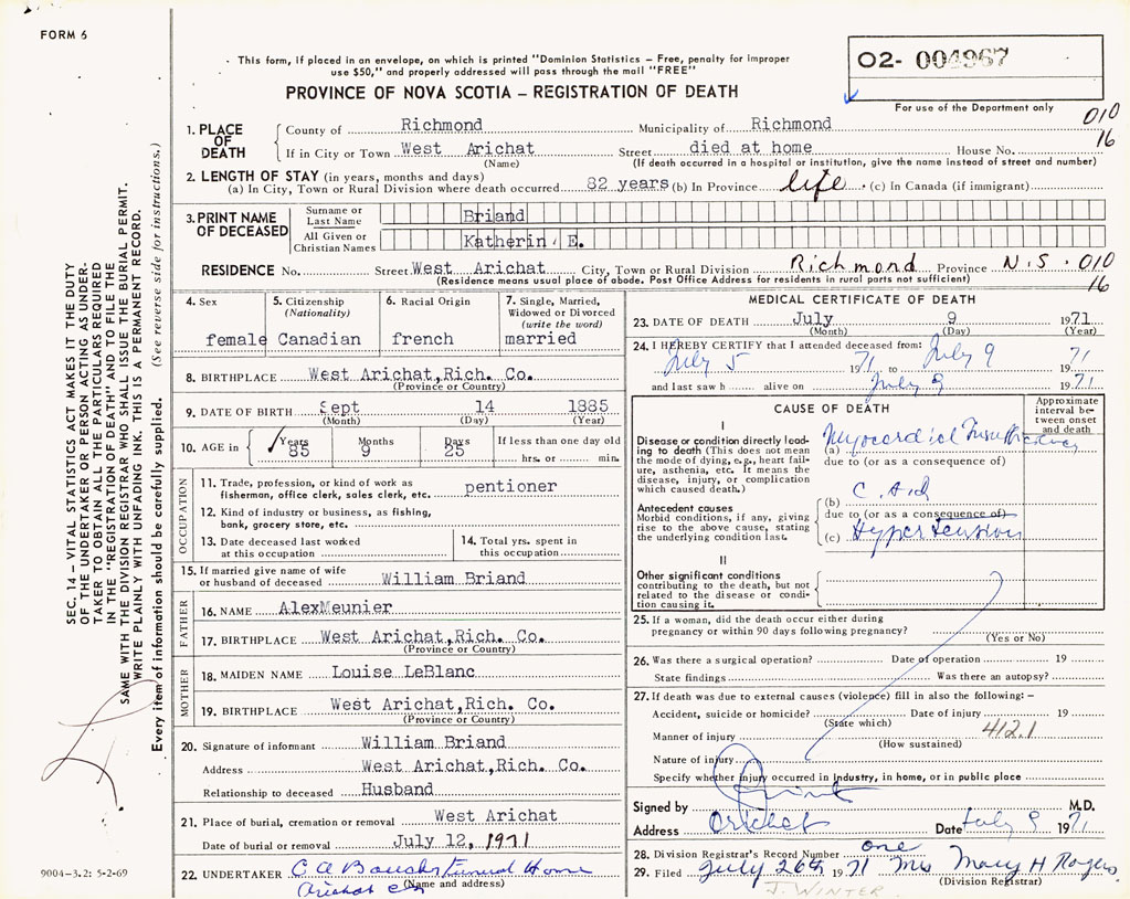 1. PLACE OF DEATH County of Richmond If in City or Town West Arichat