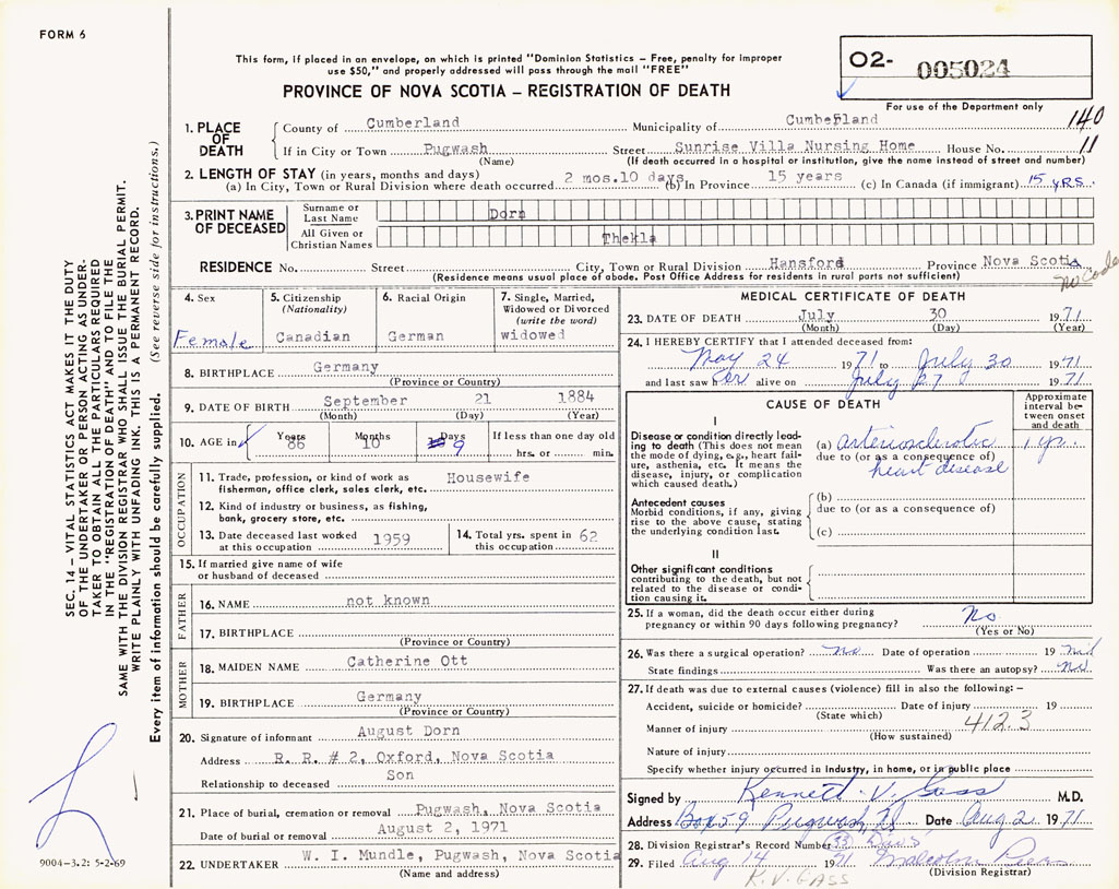 PROVINCE OF NOVA SCOTIA — REGISTRATION OF DEATH