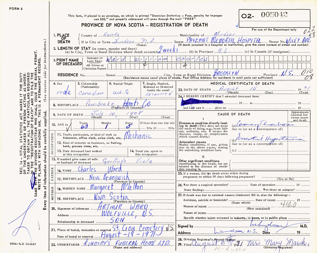 PROVINCE OF NOVA SCOTIA — REGISTRATION OF DEATH