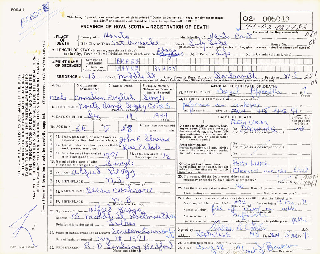 PROVINCE OF NOVA SCOTIA — REGISTRATION OF DEATH