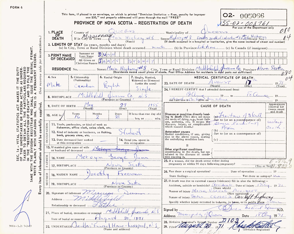 PROVINCE OF NOVA SCOTIA — REGISTRATION OF DEATH