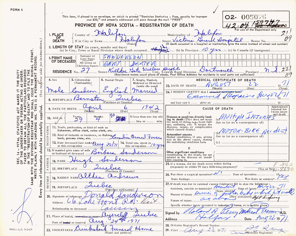 PROVINCE OF NOVA SCOTIA — REGISTRATION OF DEATH