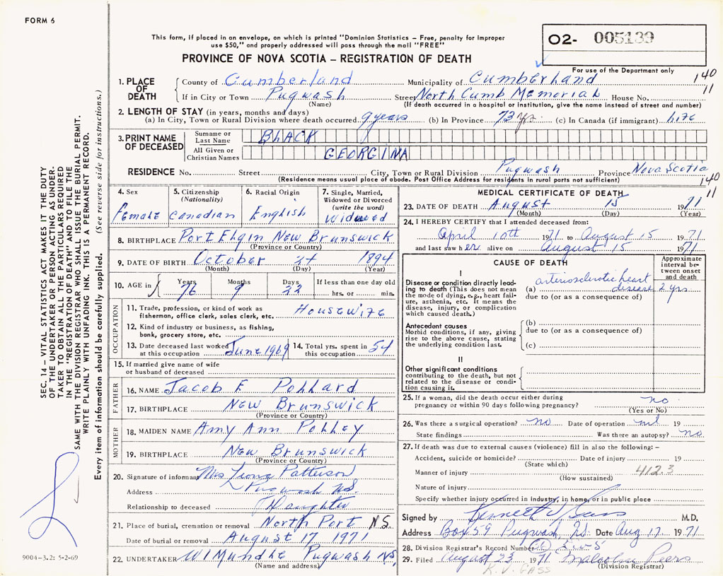 1. PLACE OF DEATH County of Cumberland If in City or Town Pugwash