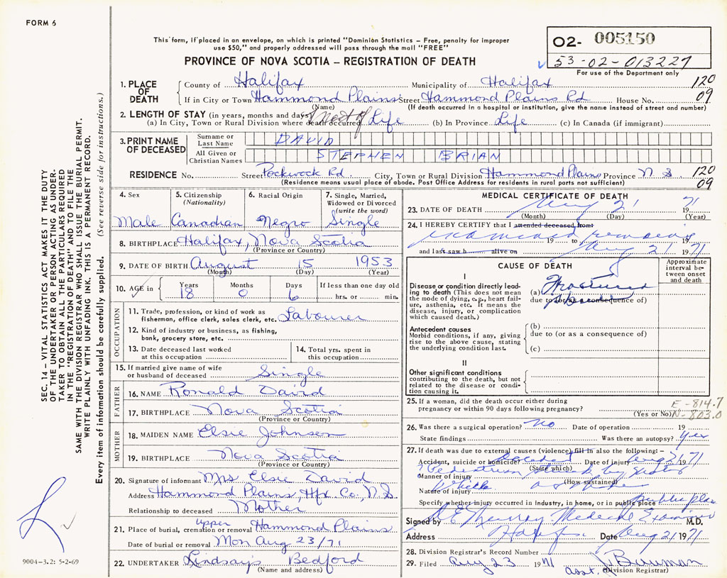1. PLACE OF DEATH County of Halifax If in City or Town Hammonds Plains