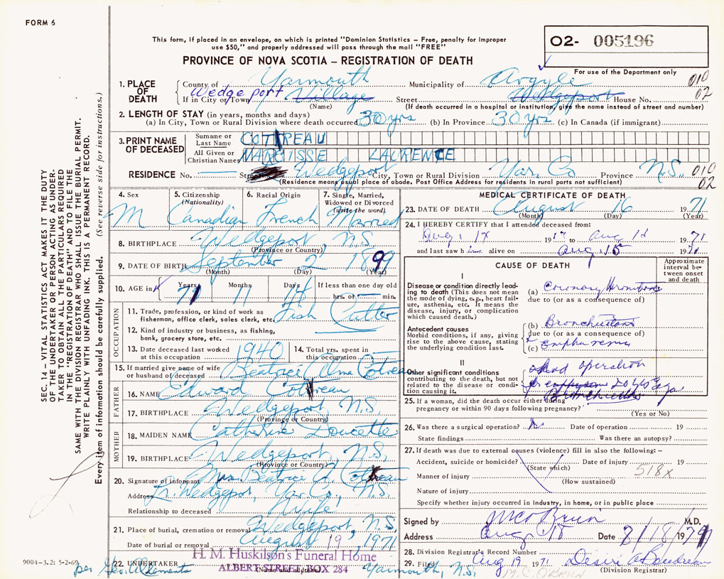 1. PLACE OF DEATH County of Yarmouth If in City or Town Wedgeport